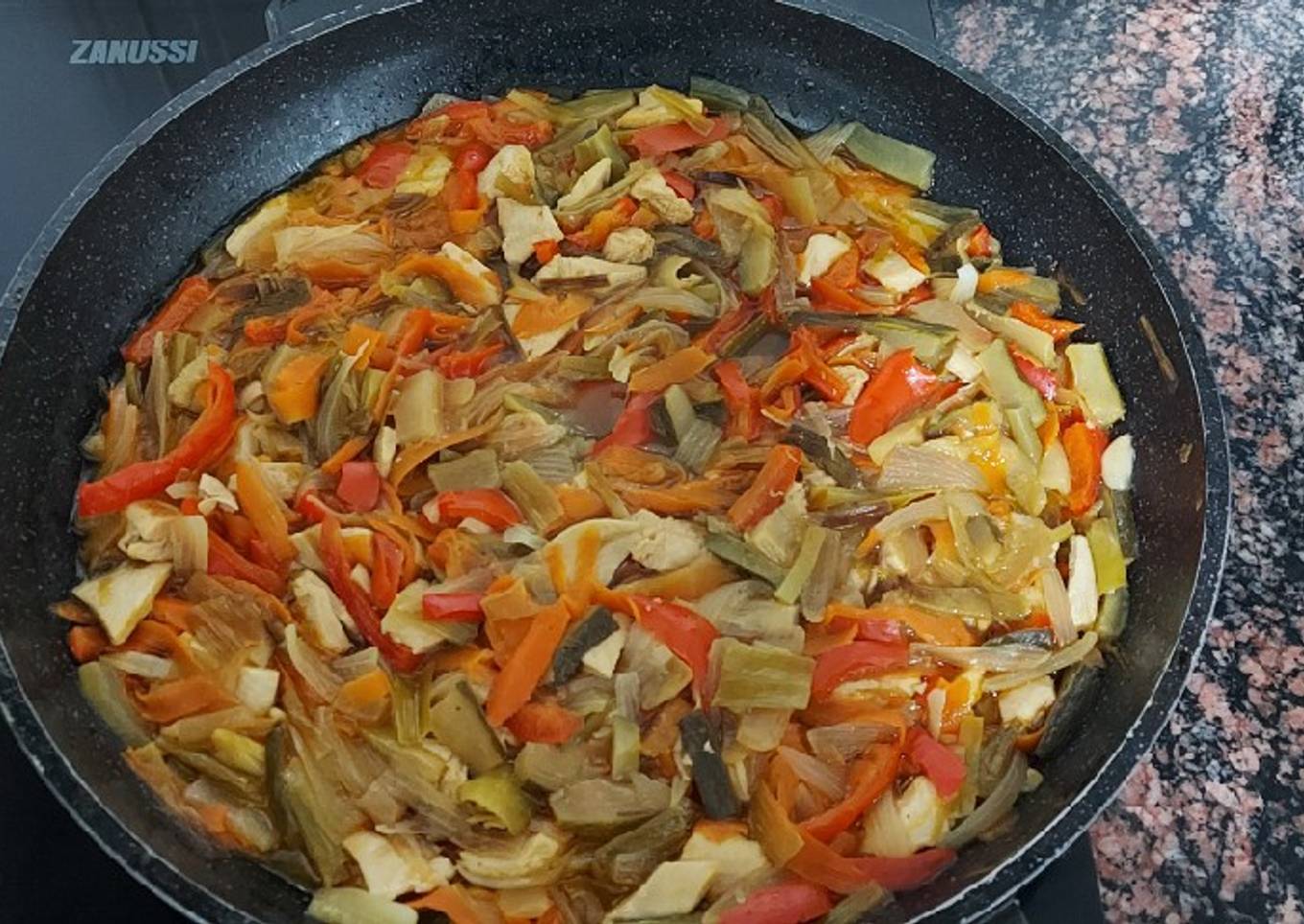 - En la misma sartén ponemos la verdura y vamos rehogandoa fuego medio alto. Mientras picamos la pechuga a tiras.