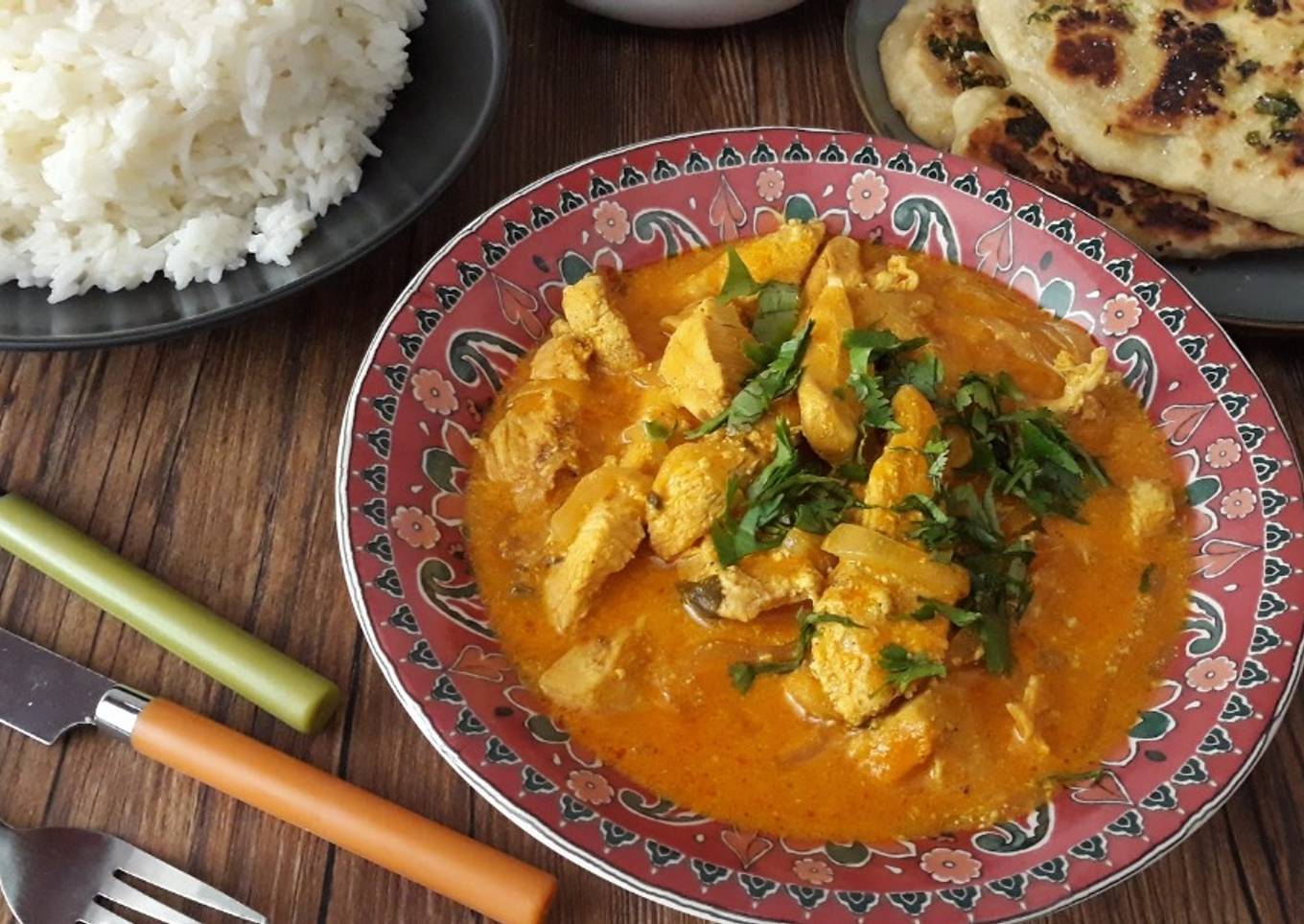 - Y servimos el pollo con cilantro picado y el arroz. Hoy lo hemos tomado con pan naan muy apropiado para este plato.