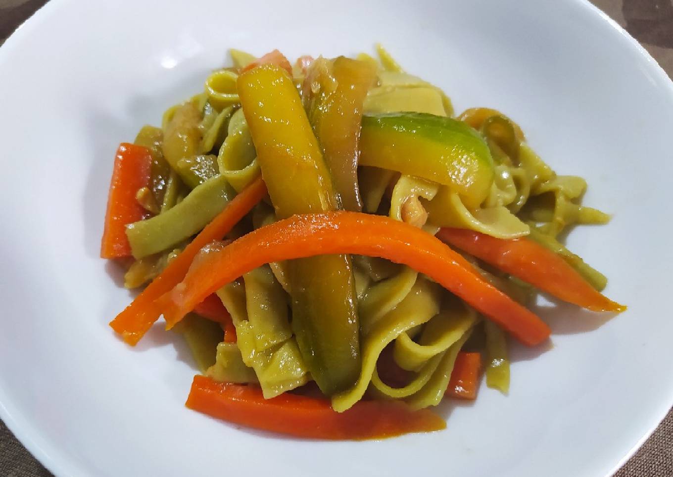 - Cortar en tiras la pechuga, la zanahoria y el calabacín. Trocear la cebolla grande. Mientras cocemos los fetuchinis con aceite y sal al gusto y reservamos