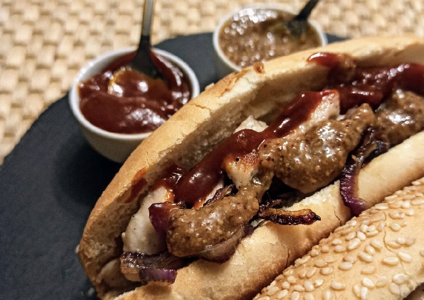 - Podemos tostar ligeramente el pan ligeramente. Rellenamos el pan con el pollo y la cebolla y ponemos las salsas que más nos gusten, mostaza, kepchup, la maravillosa salsa que currywurst que hicimos en el taller con Sara la semana pasada o incluso guacamole, que tiene que quedar genial.¡Buen provecho!!!