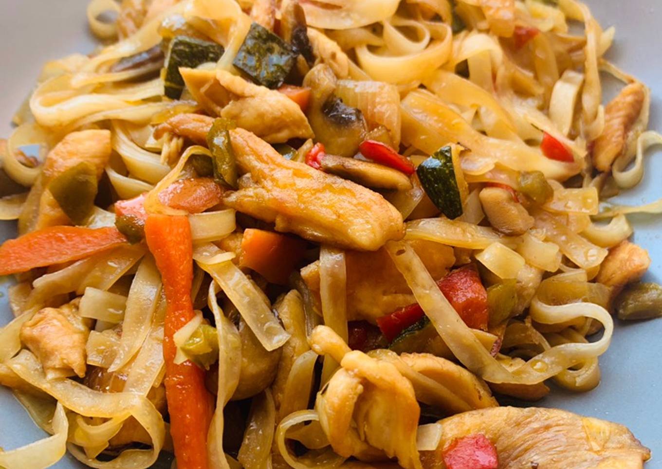- Por último cuando esté el pollo y las verduras bien doradas se le añade salsa de soja dulce, lo mezclamos todo y añadimos los noodles que estábamos cociendo.