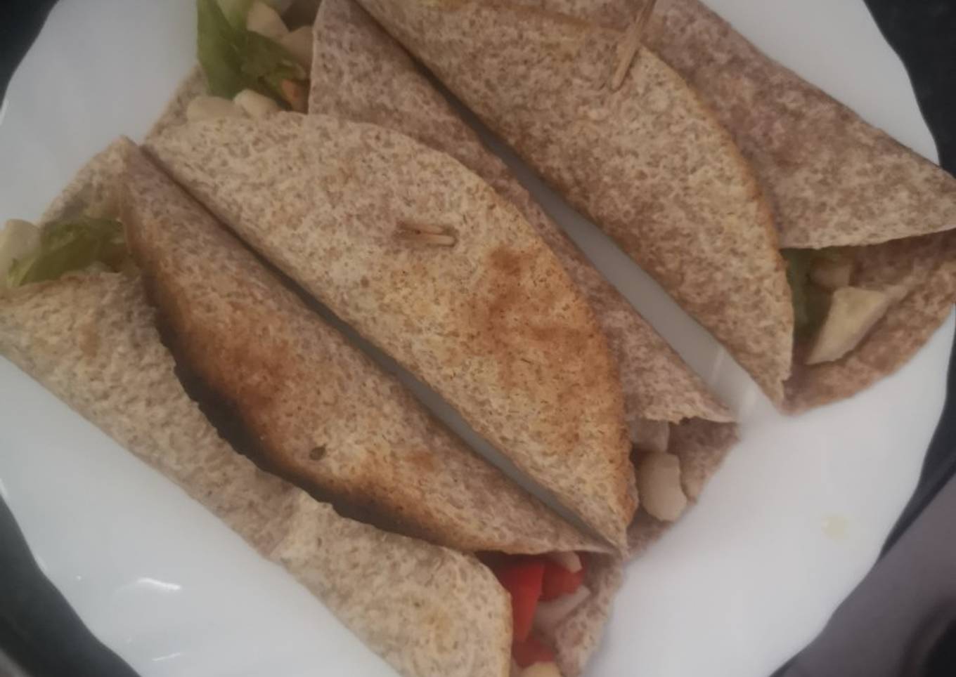 - En el pan de pita ponemos un poco pimiento de cebolla de lechuga de pollo en tiras y de salsa picante y cerramos estilo kebab y ponemos en el horno durante unos minutos listo.
