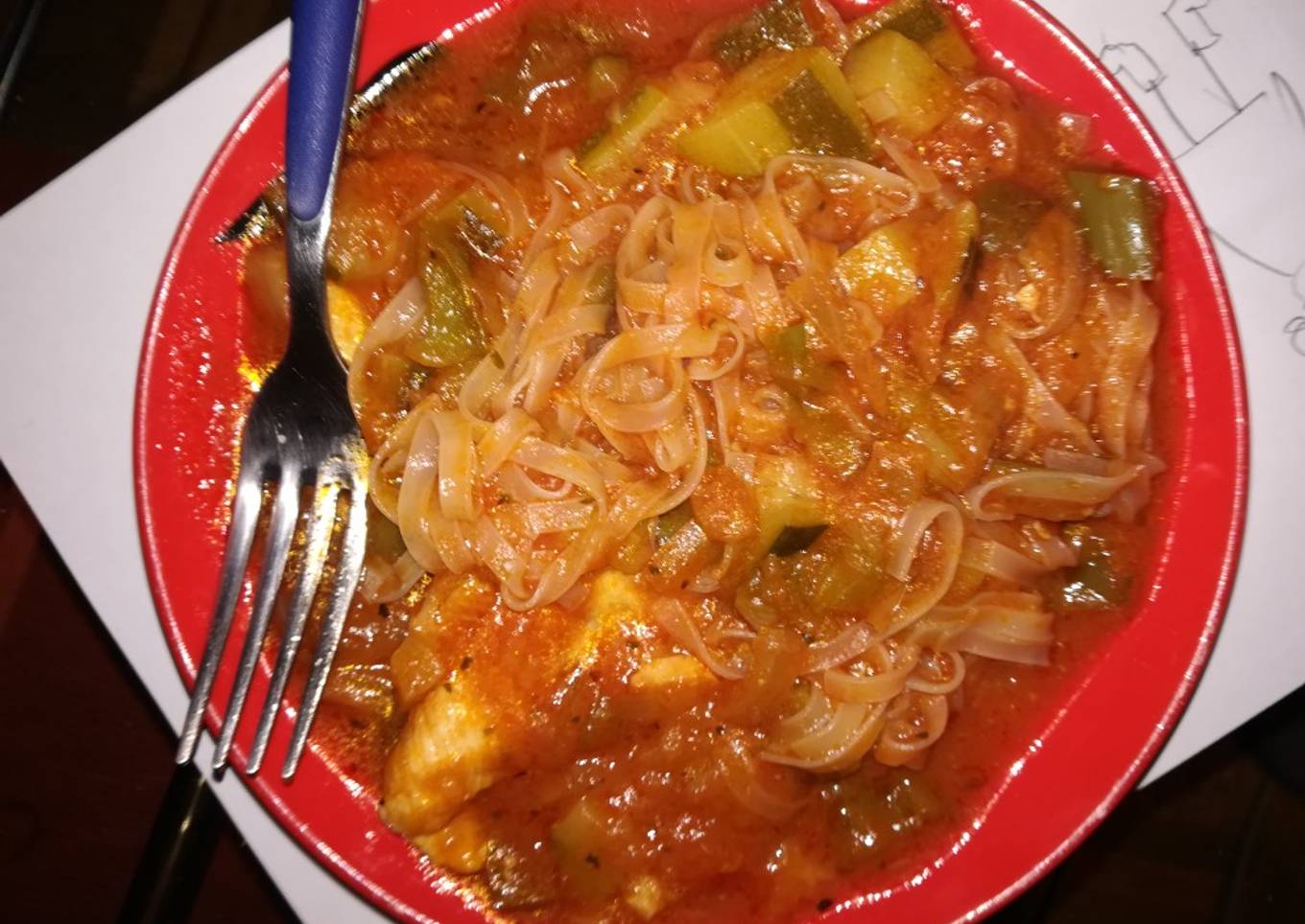 Fideos con pisto y pollo
