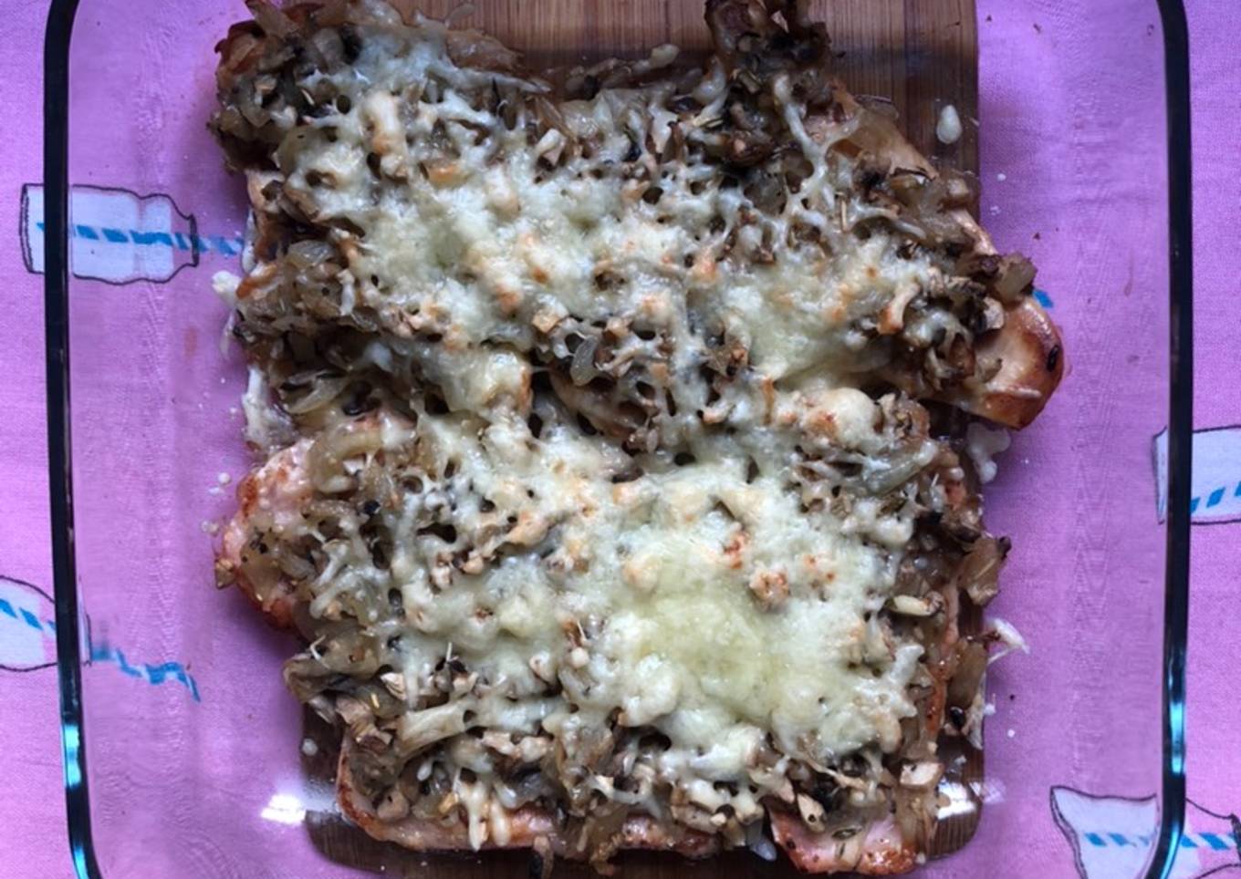 - Coloca en la bandeja los filetes de pollo, y extiende por encima el sofrito de cebolla y champiñones. Añade un poco de queso rallado por encima y al horno.