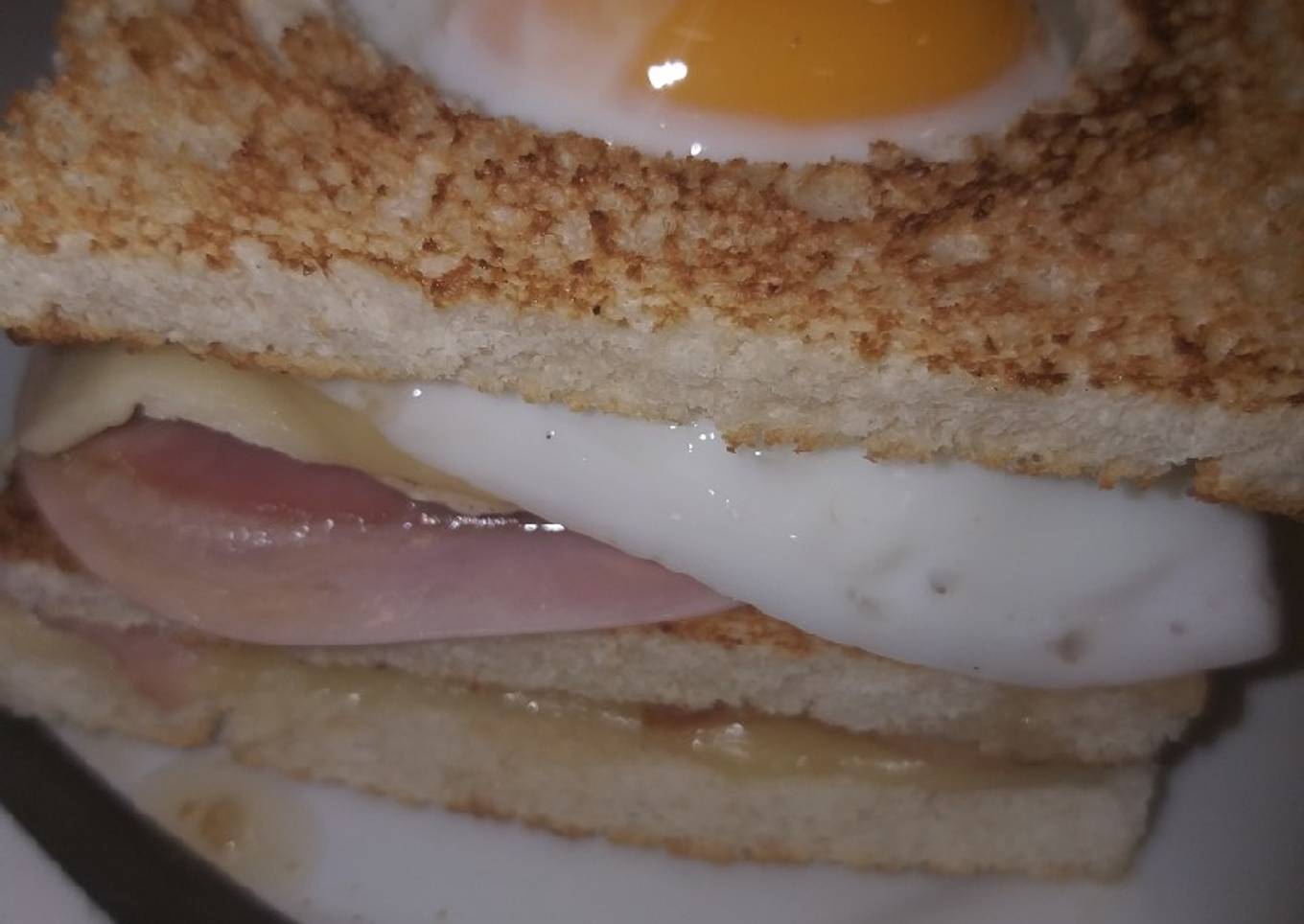- Una vez todo listo montamos ponemos la rebanada pan sartén ponemos queso jamón York rodaja tomate el Bacon y la pechuga sacamos sartén y ponemos otra rodaja con un agujero en medio la tapa tenemos tostada por los 2 lados ponemos allioli tapamos al otro lado salsa ranchera ponemos rodaja jamón York tomate bacon la rueda cebolleta queso pechuga escarola otra de queso y el huevo frito ponemos la tapita con su agujero y....Bon profit