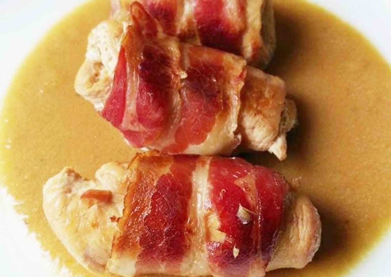 Una muy buena manera de presentar unas pechugas de pollo, junto con el bacon, queda un plato muy sabroso y rico, rico.