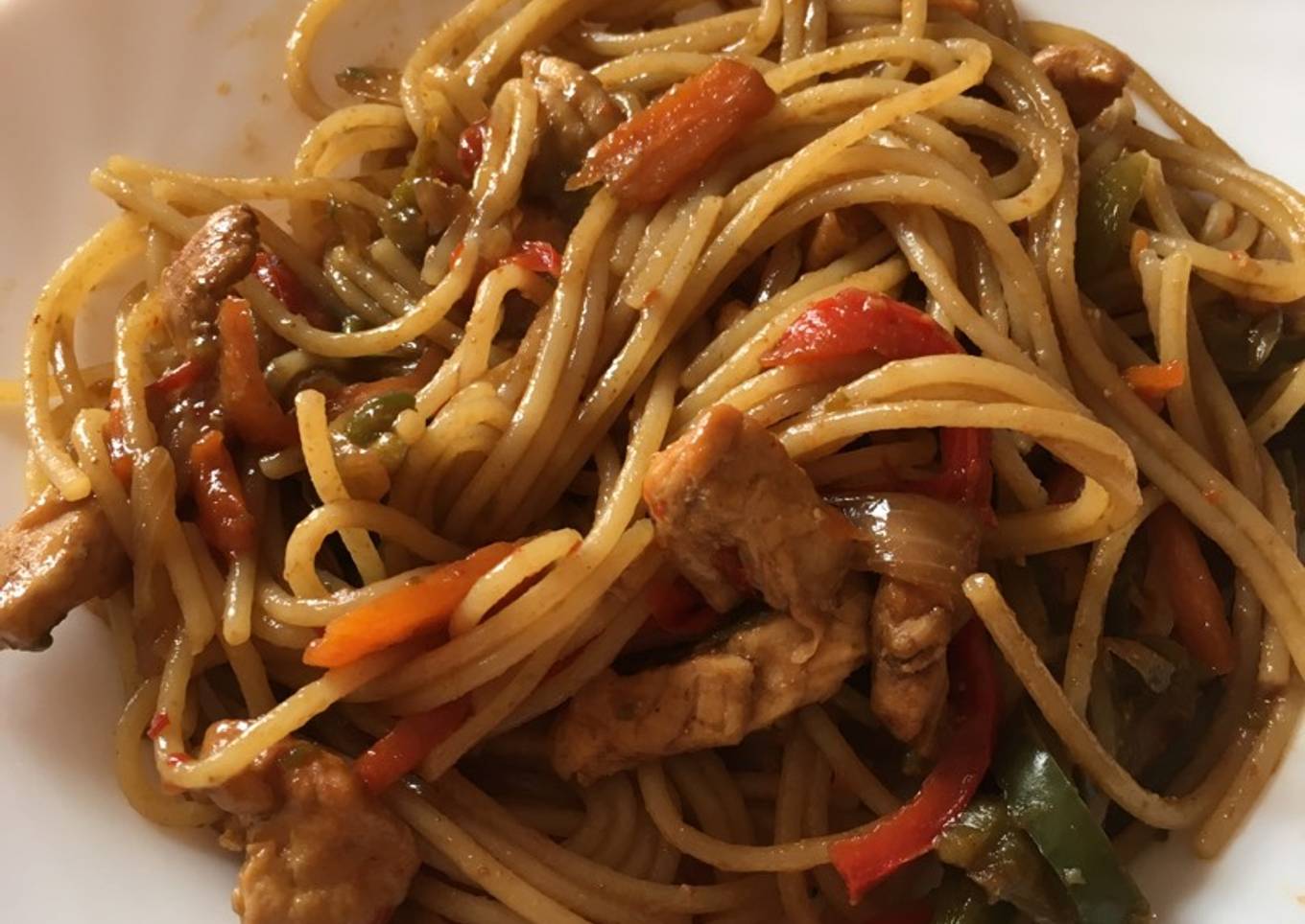 - Se ponen a hervir los espaguetis o tallaries y se cortan los pimientos, zanahoria y cebolla a tiras, se cocina en la sartén con un chorro de aceite, cuando ya está pochadita, se le echa la pechuga y se cocina todo hasta el pollo esté doradito y se sazona todo con el sazonador de barbacoa